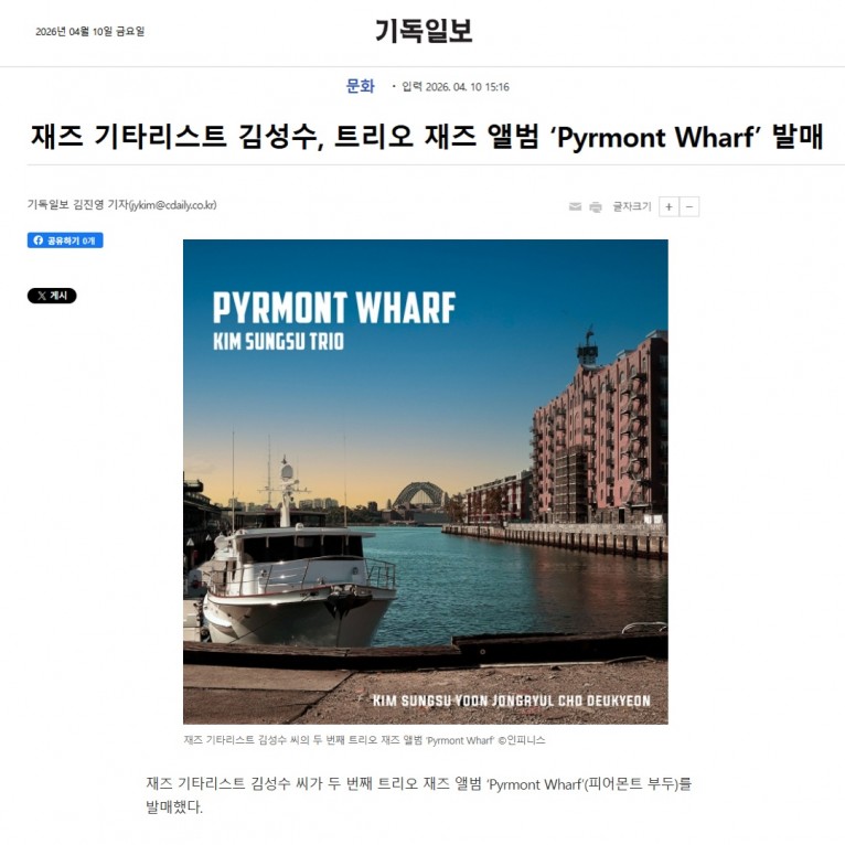 뮤직타임 [기사] 재즈 기타리스트 김성수, 트리오 재즈 앨범 ‘Pyrmont Wharf’ 발매(기독일보)