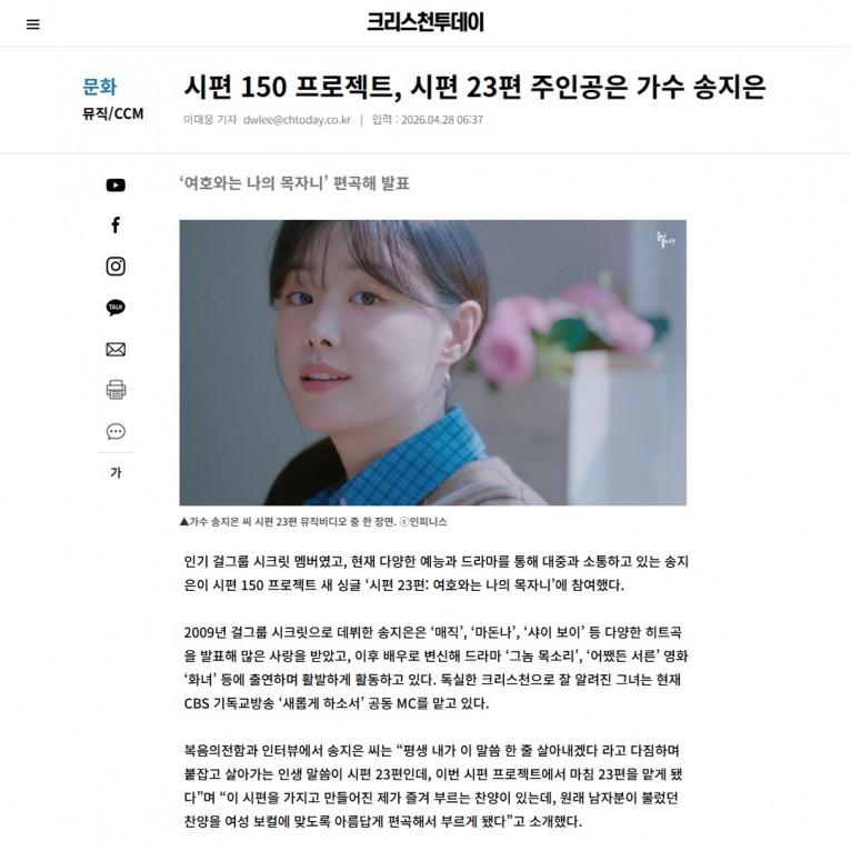 [기사] 시편 150 프로젝트, 시편 23편 주인공은 가수 송지은(크리스천투데이)