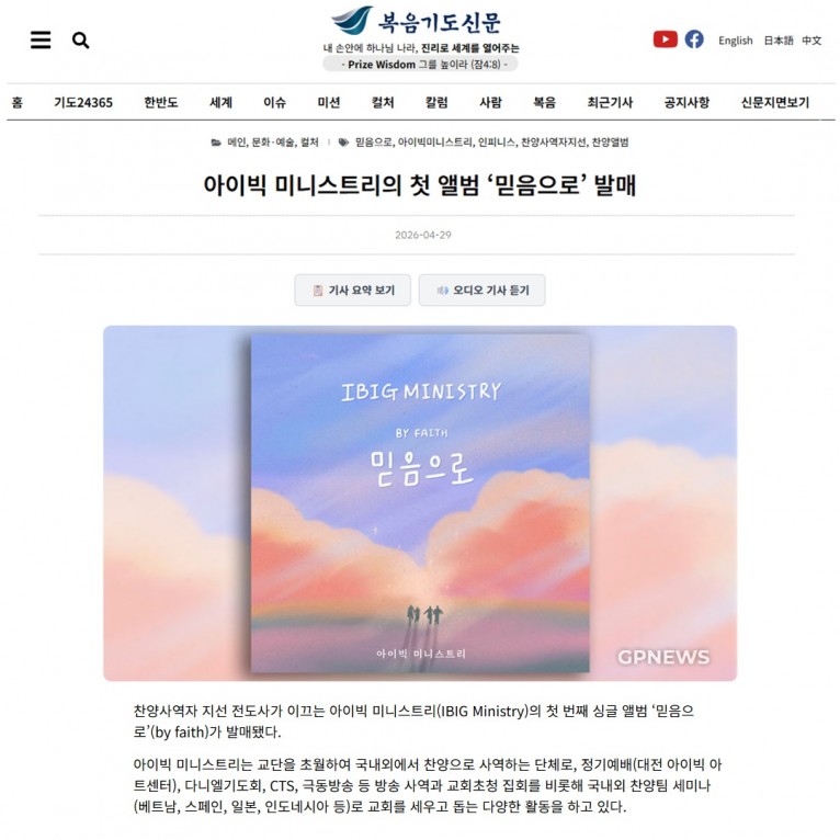 [기사] 아이빅 미니스트리의 첫 앨범 ‘믿음으로’ 발매(복음기도신문)